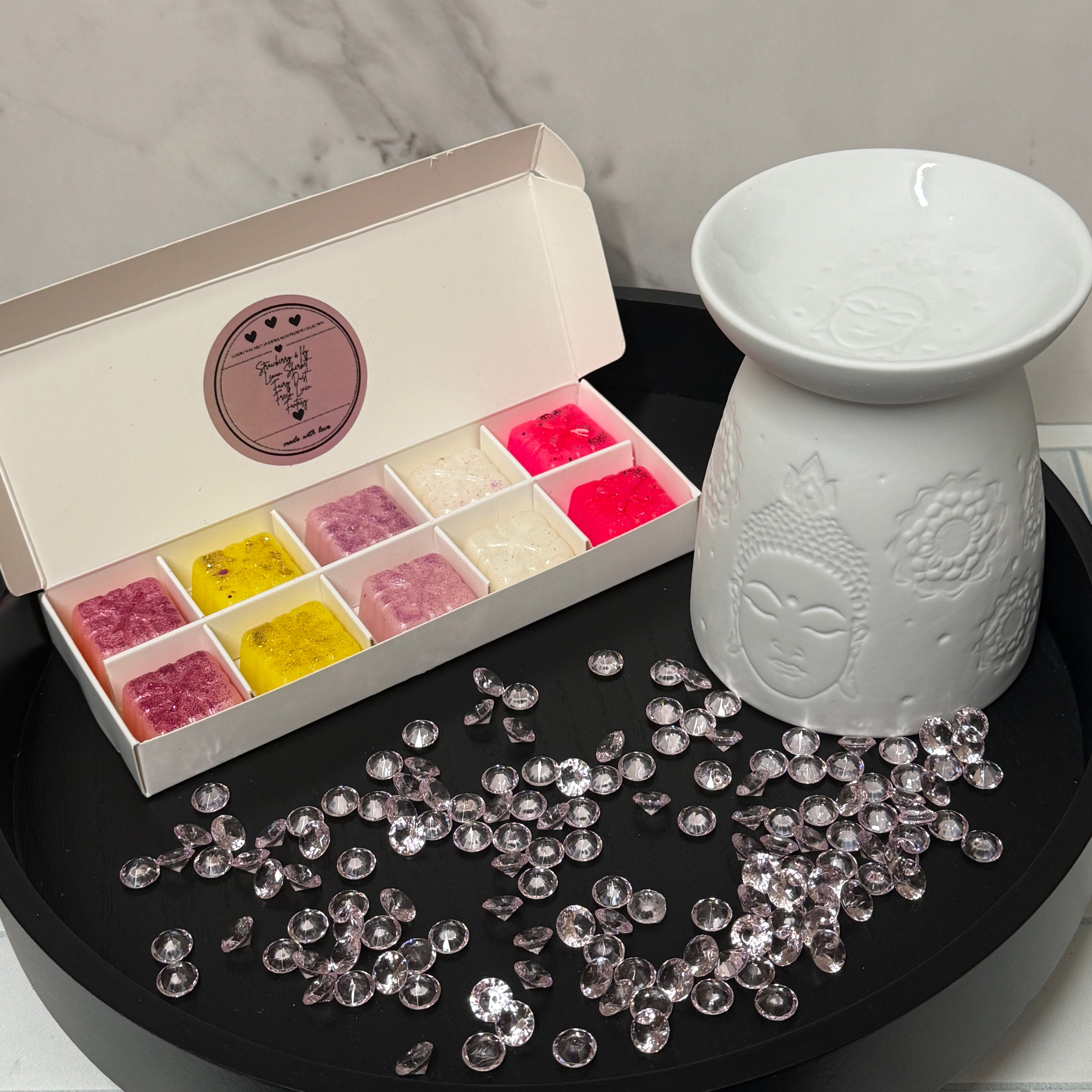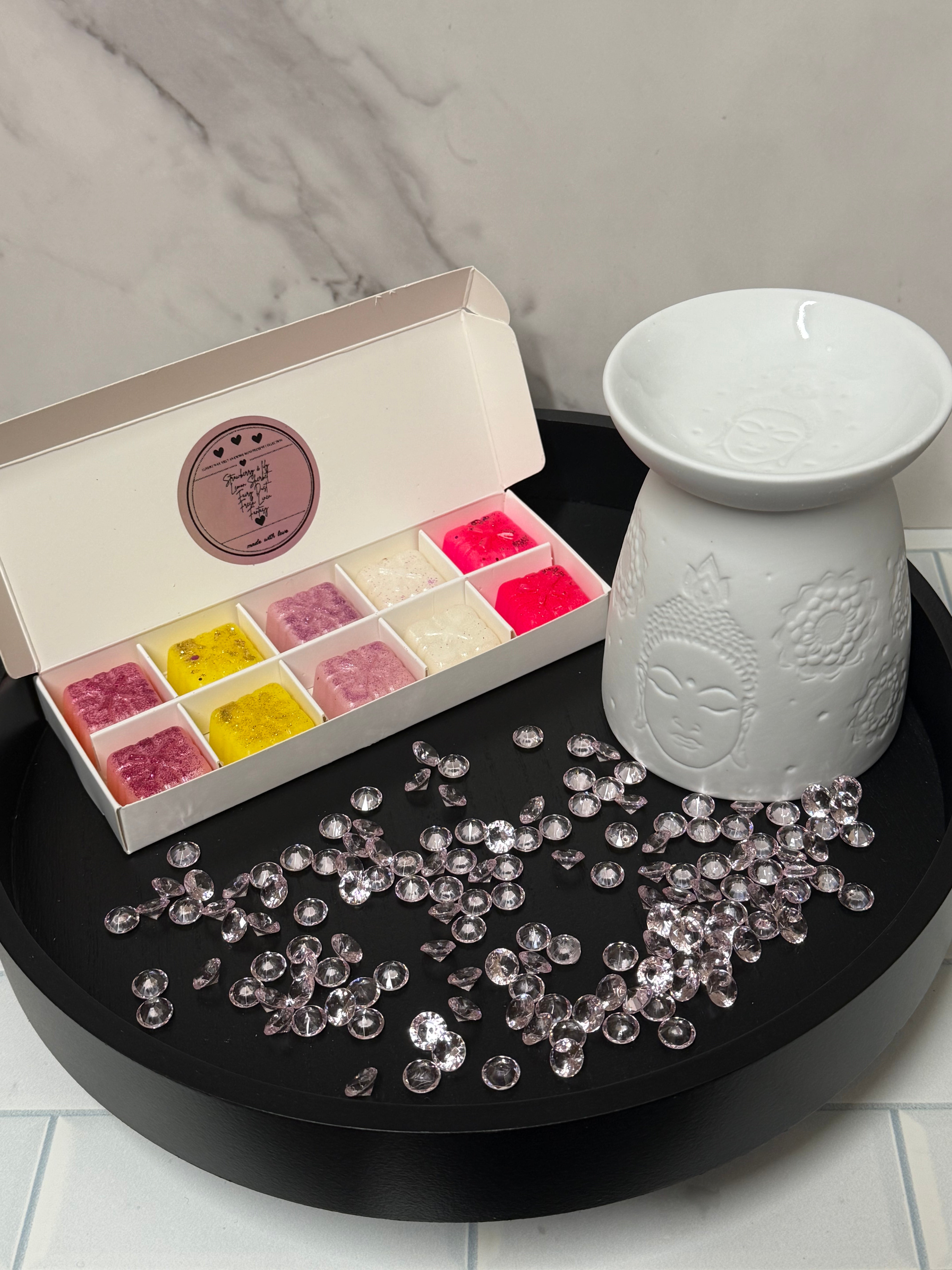 Celebrate mum with our fabulous ceramic budha wax melter and an incredible assortment of wax melts including scrumptious Strawberry & Lily, zesty Lemon Sherbet, magical Fairy Dust, and refreshing Fresh Linen and Fantasy. A perfect treat for your awesome mum! :-) comes with our gorgeous kraft gift bag :-)
